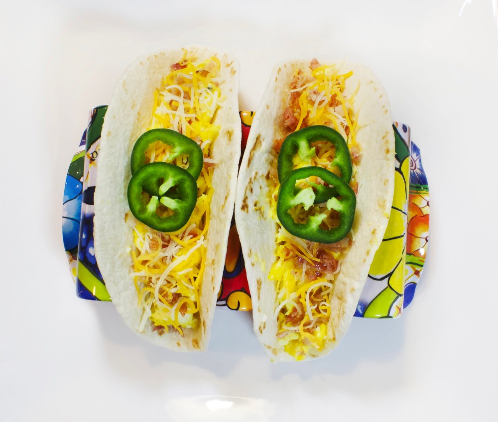 In a medium bowl, whisk together the eggs. Melt the butter in a small pan over medium heat, until the butter coasts the whole pan and starts to foam. Add the eggs to the pan and immediately reduce heat to medium-low. Using a spatula, gently push the eggs from one end of the pan to the other. When the eggs are cooked thoroughly, remove from the heat. Transfer scrambled eggs to a small bowl. Place tortillas on a flat plate and spoon egg mixture in the middle of tortillas. Start to spread out your eggs a little on tortillas. Next, take the chopped bacon and sprinkle it on top of eggs. Sprinkle shredded cheese on top of bacon. Lastly, add a couple of sliced jalapeño peppers on each tortilla if you choose to do so. If you want to melt the shredded cheese a little feel free to place tacos in the oven for a few minutes or the microwave. Pour yourself a mimosa, because after all it is #brunch. Enjoy!