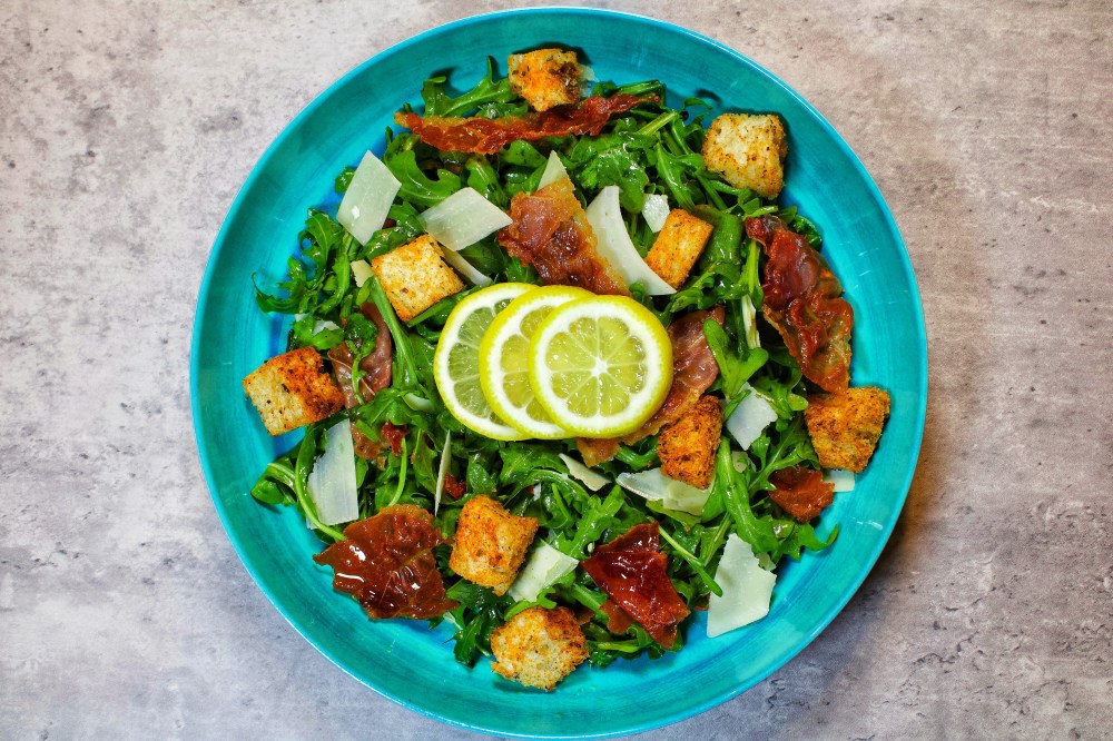 In a small mixing bowl add extra virgin olive oil, juice of lemon, salt and pepper. Whisk dressing together and set aside. Heat up a small sauté pan with oil and add prosciutto. Cook prosciutto for about five minutes, or until prosciutto gets crispy. Once the prosciutto gets crispy, take pan off heat. On a cutting board roughly chop prosciutto. Set aside chopped up prosciutto. In a salad bowl, add arugula, shaved parmesan cheese, chopped prosciutto and croutons. Lastly, pour dressing over salad and toss until dressing is combined. Serve and enjoy!
