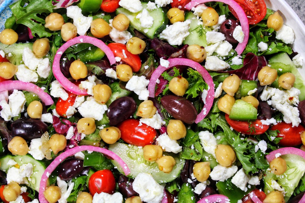In a small bowl add chickpeas (after they are drained). To the chickpeas, add minced garlic, extra virgin olive oil, crushed red pepper flakes, salt and pepper. Stir mixture well and set aside. In a large bowl add mixed greens, olives, tomatoes, cucumber, fresh basil and dill, marinated chickpeas, pickled onions and lastly, feta cheese crumbles. Pour dressing over salad and toss to combine. Serve salad in your favorite bowl and enjoy!