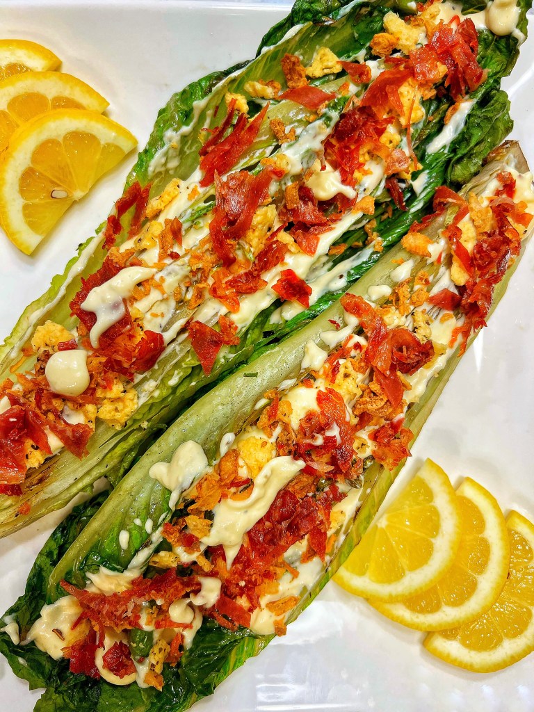 Happy Thursday! I hope everyone is having a good week so far. Now that the warmer weather is here to stay, I have been testing out some summer recipes. I created a Loaded Grilled Romaine Salad this week. If you are a fan of grilled romaine salads like myself, then this recipe is for you! There’s something about the flavor of grilled romaine. As the romaine gets grilled, the leaves get wilted, which makes them tender and delicious. I added parmesan crisps, crispy prosciutto, frizzled onions, and a drizzle of creamy Cesar dressing. This is the perfect side dish to serve this summer at family barbecues, gatherings or even weeknight dinners. Have a great weekend!