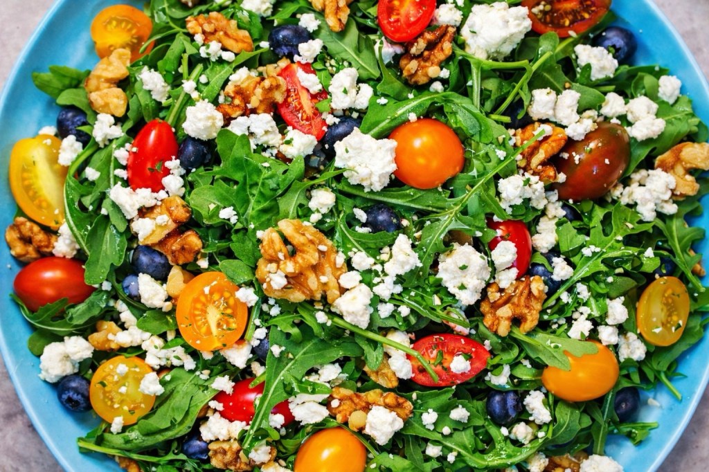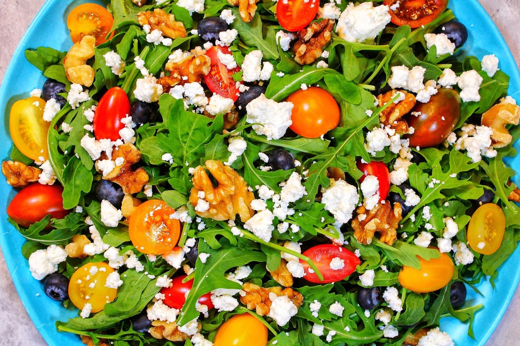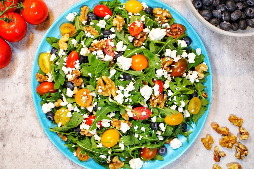 Happy Friday friends! I have another delicious salad to share with you all this week. The inspiration for this weeks recipe came from my love for farmers markets. There is nothing like going to a farmers market on the weekend during the summer! I love checking out all the local famers markets in my area. You can’t beat the fresh produce from local farms. This week I created a Farmers Market Salad with fresh arugula, blueberries, tomatoes, creamy goat cheese and crunchy walnuts all dressed in a creamy balsamic dressing. This is the perfect salad for summer, especially on those hot summer days. Have a beautiful weekend!