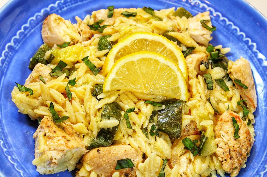 Pat chicken breasts dry with paper towels. Season chicken breasts with Italian seasoning. Heat a sauté pan over medium-high heat with oil. Sauté chicken until cooked thoroughly and internal temperature reaches 165 degrees. Once chicken is done cooking, transfer to a plate and cut up into cubes. Set aside and cover. In a small pot cook orzo in salted water according to the package instructions. When orzo is done cooking set aside. In a sauté pan, over medium-high heat add butter. Add in garlic and shallots and stir until fragrant for about 1 minute. Add in zucchini and season with salt and pepper. Cook zucchini until it gets tender for about 5 minutes. After zucchini is cooked remove from pan and set aside. In the same pan add oil and orzo. To the orzo add in lemon juice and zest. Stir orzo and add in chicken and zucchini. Continue stirring orzo mixture. Lastly, add basil and stir mixture. Garnish with any extra lemon or basil. Enjoy!