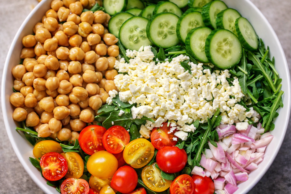 In a small bowl add extra virgin olive oil, balsamic vinegar, salt and pepper. Stir salad dressing ingredients together until well combined. Set salad dressing aside. In a large bowl, add arugula, chickpeas, shallots, cherry tomatoes, cucumbers and feta cheese. Pour dressing mixture over salad and toss until salad is coated in dressing. Serve in your favorite salad bowl and enjoy!