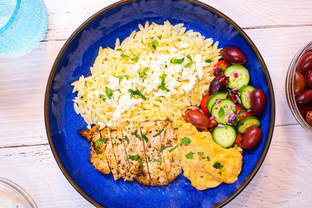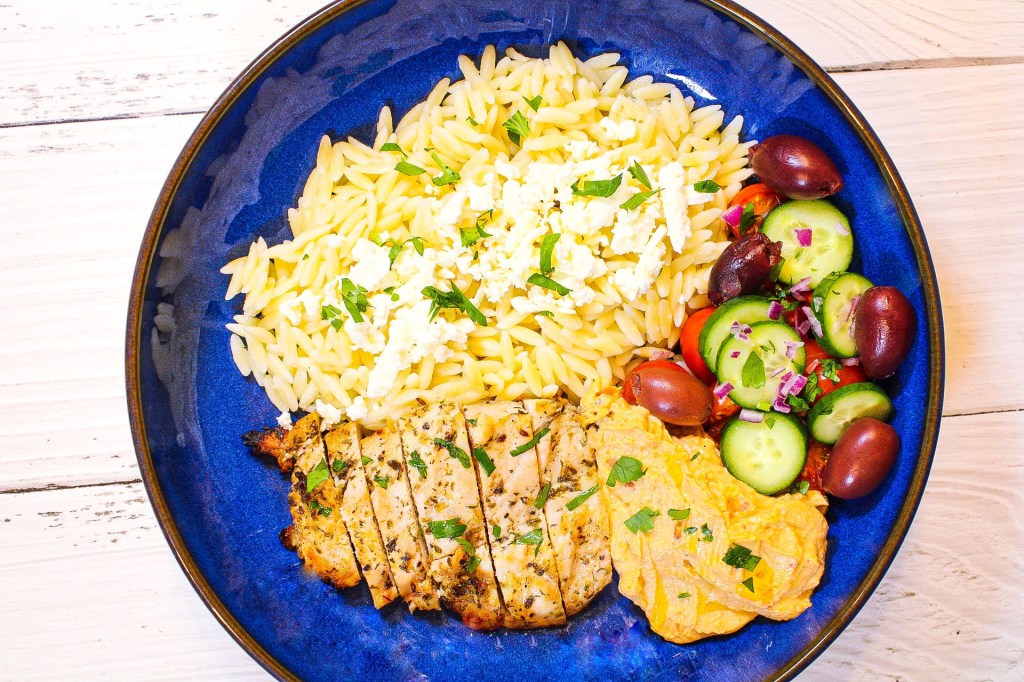 After removing chicken from package and patting dry, place chicken in ziplock bag with garlic, extra virgin olive oil, lemon juice and dried oregano. Shake very well until chicken breasts are coated completely in marinade. Set aside until ready to cook. Preheat grill if you are using it. You can also sauté chicken breasts too. Cook dry orzo according to package. Once cooked set aside until ready to assemble. Add a little oil to orzo so it doesn’t stick. While chicken cooks whether you are grilling or sautéing, chop up cucumbers, tomatoes and onion. Set all your veggies aside. Once chicken is cooked thoroughly and no longer pink, take off grill or sauté pan. Place chicken on a cutting board and slice. In a bowl, spoon orzo on bottom, then add chicken, veggies, olives, hummus and tzatziki sauce. Sprinkle crumbled feta cheese on top of orzo and garnish bowl with fresh parsley. Enjoy!