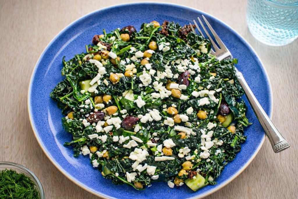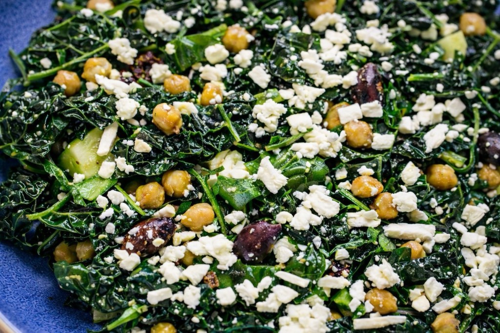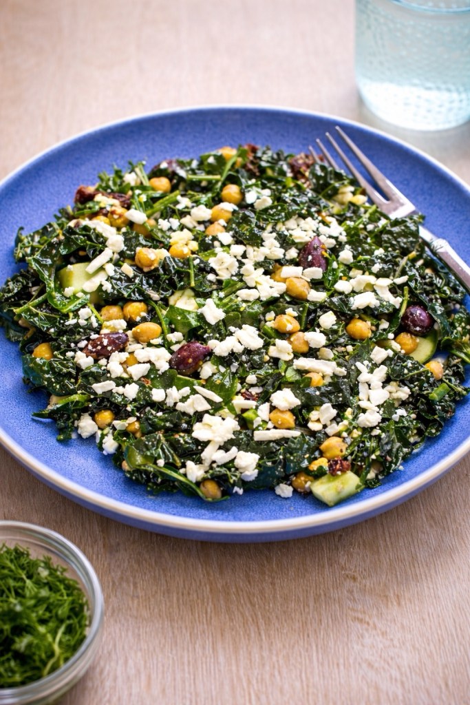 Tender kale is tossed with crisp cucumber, briny olives, and hearty chickpeas, then finished with crumbled feta and sun-dried tomatoes for a rich pop of flavor. A simple dressing brings everything together, coating the greens and softening the kale just enough to create a salad that’s both bold and balanced.