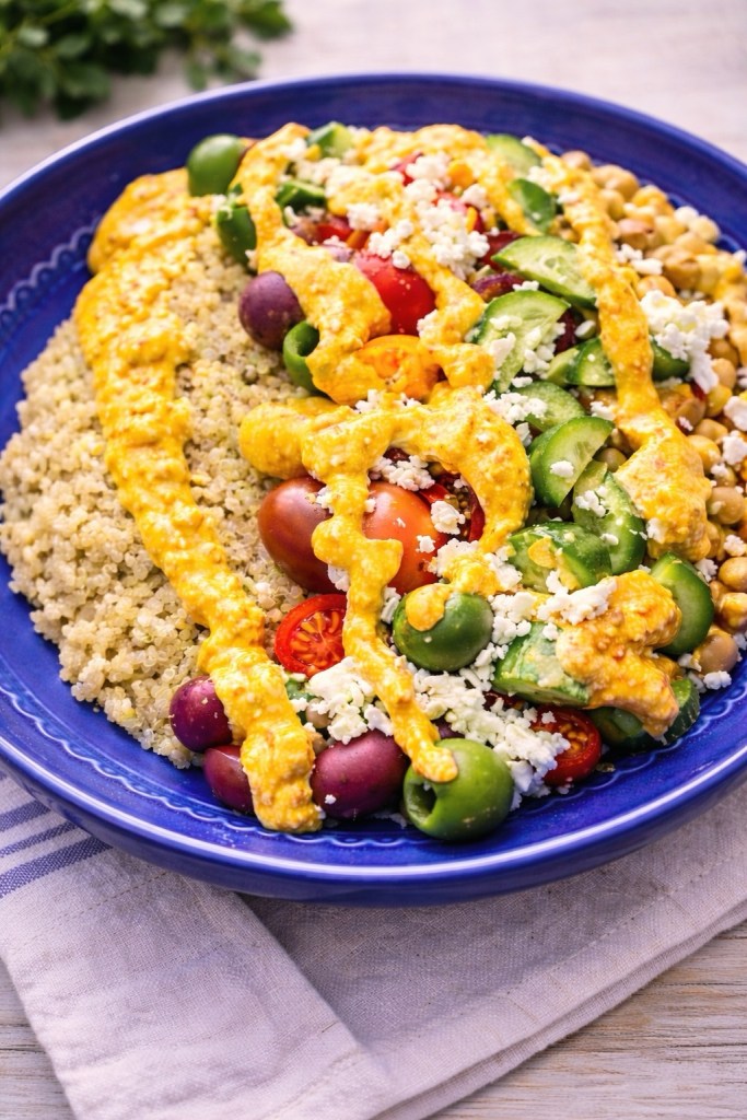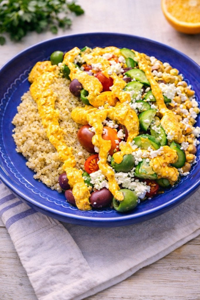 Fresh, colorful bowls like this are one of my favorite ways to bring bold Mediterranean flavors to the table. They’re vibrant, nourishing, and layered with textures that make every bite interesting—from tender grains to crisp vegetables and creamy cheese.