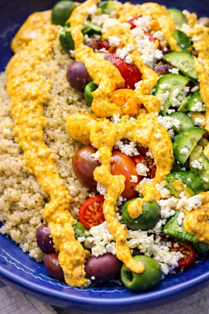 This Mediterranean quinoa bowl brings together fluffy quinoa, juicy tomatoes, crunchy cucumbers, briny olives, and chickpeas, all finished with crumbled feta and a rich, golden tahini-style dressing drizzled over the top. The combination is bright, satisfying, and packed with flavor.