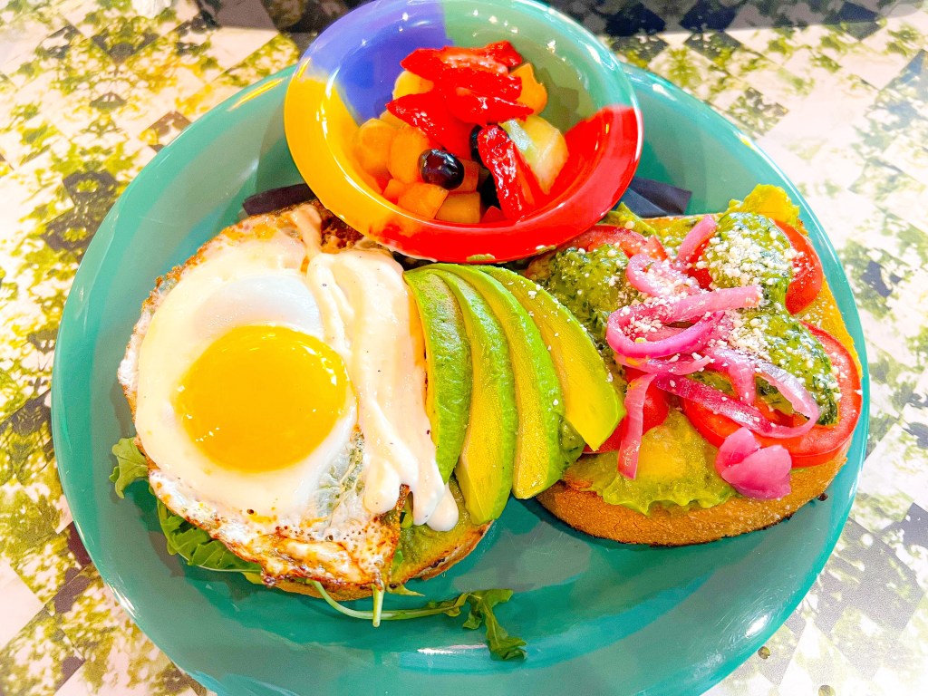 Left: Sally’s Avocado Toast- whole wheat toast loaded with avocado: One sided served with arugula, a sunny side up egg and everything bagel aioli. The other with sliced tomato, cotija cheese, chimichurri and pickled onions. Served with fresh fruit salad.