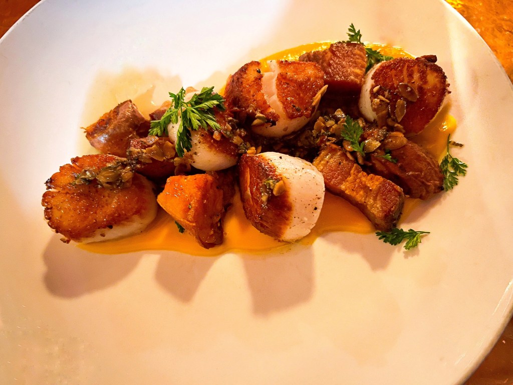 Right: Day Boat Scallops with Sweet Potatoes, Bacon and a Butternut Squash Purée