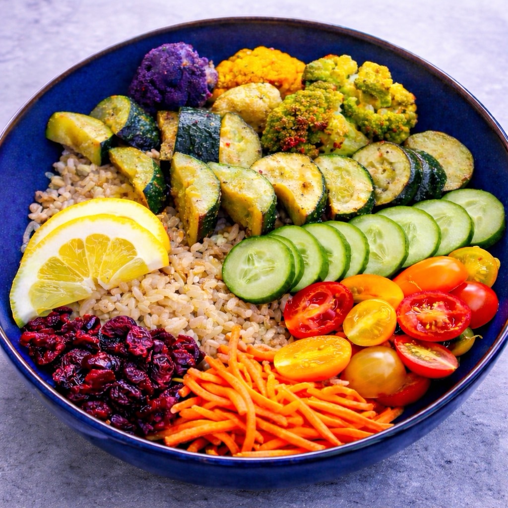 Colorful, nourishing, and full of fresh flavor, this vibrant grain bowl is a perfect example of how simple ingredients can come together to create something both beautiful and satisfying. Built on a base of hearty brown rice and layered with roasted vegetables, crisp cucumbers, juicy cherry tomatoes, and bright citrus, every bite offers a wonderful balance of textures and flavors.