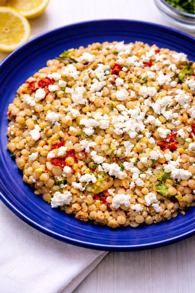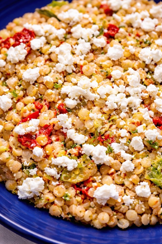 Tender pearl couscous is tossed with cherry tomatoes, fresh herbs, garlic and then finished with crumbled feta for a creamy, salty balance. The result is a dish that feels both rustic and refined—perfect for everything from casual weeknight dinners to spring and summer gatherings.