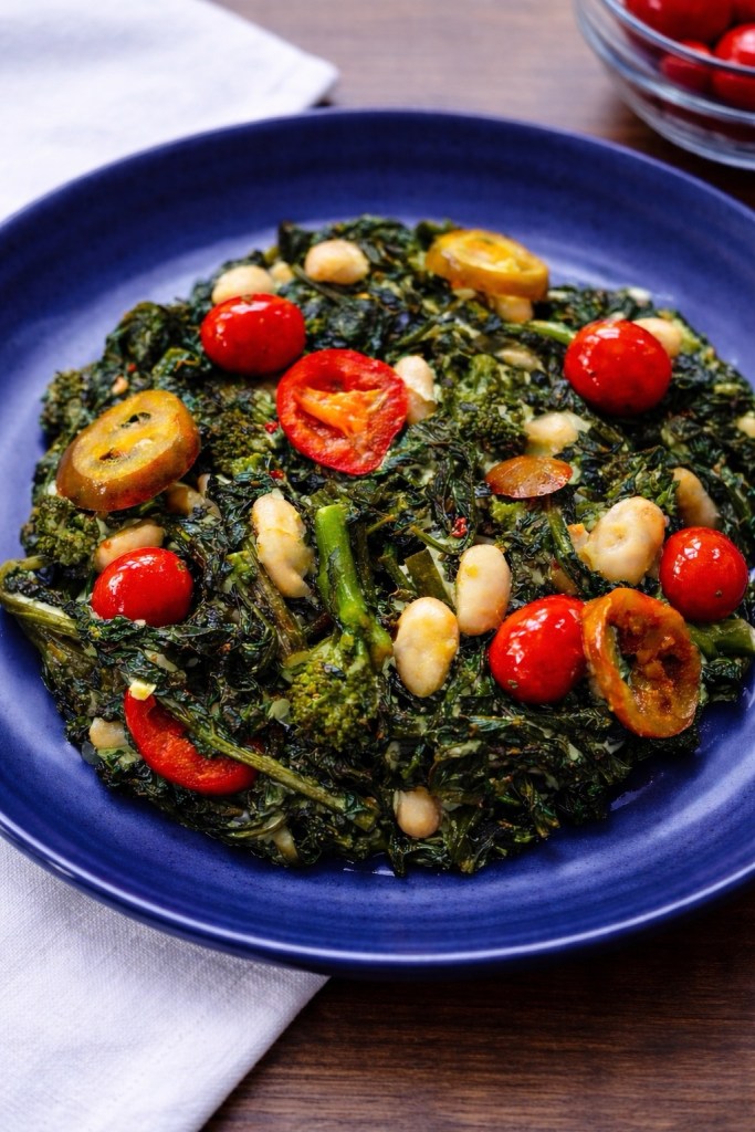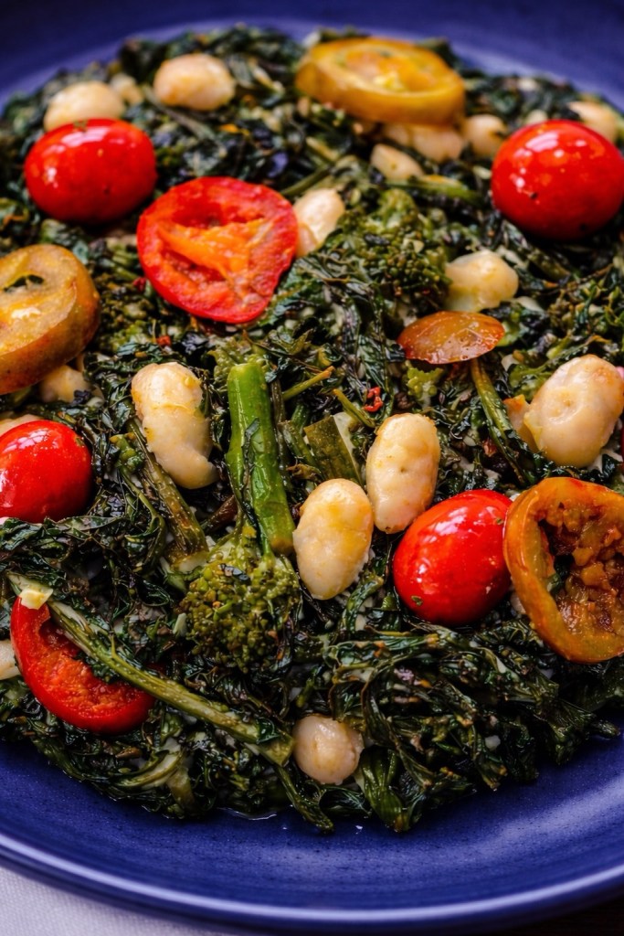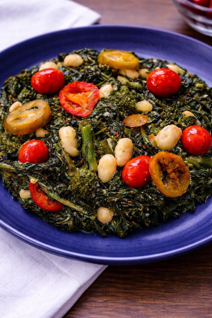 Tender broccoli rabe is lightly sautéed until perfectly crisp-tender, then tossed with creamy cannellini beans and sweet burst cherry tomatoes. A touch of garlic, olive oil, and a hint of heat from pickled peppers bring everything together, creating a dish that feels both rustic and refined.
