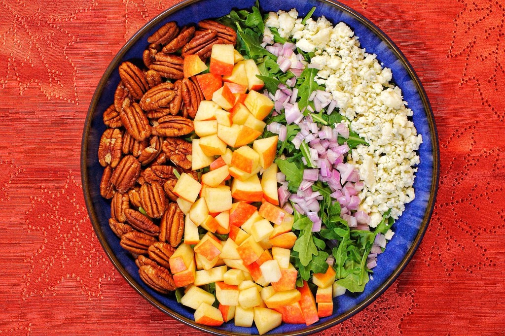 In a small bowl add olive oil, apple cider vinegar, maple syrup, salt and pepper. Stir salad dressing and set aside. In a large salad bowl, add arugula, apples, shallots, pecans, and gorgonzola cheese. Pour salad dressing over salad and toss to combine. Serve and enjoy!