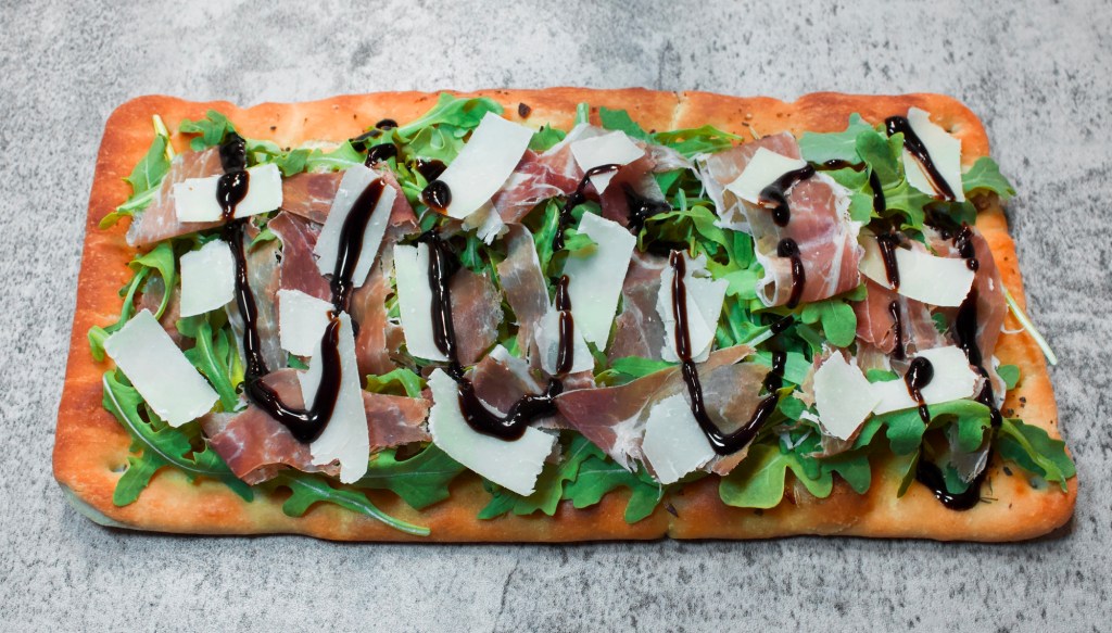 Pre heat oven to 400 degrees. In a large frying pan, sauté garlic and shallot in oil and season with salt and pepper. Sauté for about 5-7 minutes. Once shallot and garlic are cooked take off heat and set aside. Take your flatbread and brush olive oil all over it. Make sure the whole flatbread is coated with olive oil. Evenly spread the cooked shallot and garlic onto flatbread. Place flatbread in oven and cook for about 10-15 minutes, or util flatbread is a golden color. After flatbread is cooked take it out of the oven. Place arugula on top, followed by prosciutto (I tore the prosciutto into long strips) and sprinkle with shaved parmesan cheese. Lastly, drizzle top of flatbread with balsamic glaze. Enjoy!