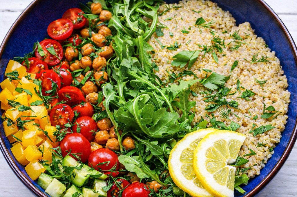 Prepare quinoa according box. Once quinoa is done cooking, let cool and set aside. Preheat oven to 400° F. After chickpeas are drained and rinsed, add them to a mixing bowl. Drizzle olive oil, paprika, oregano, garlic powder, salt and pepper. Stir chickpeas until coated in mixture. Spread chickpeas on a baking sheet lined with parchment paper. Roast for 25-30 minutes. Make sure chickpeas are crispy and a deep golden color. Remove chickpeas from oven and set aside. In a large salad bowl, add in arugula, quinoa, chickpeas, pepper, cherry tomatoes, cucumbers and fresh herbs. Lastly, dress salad and toss to combine. Enjoy!