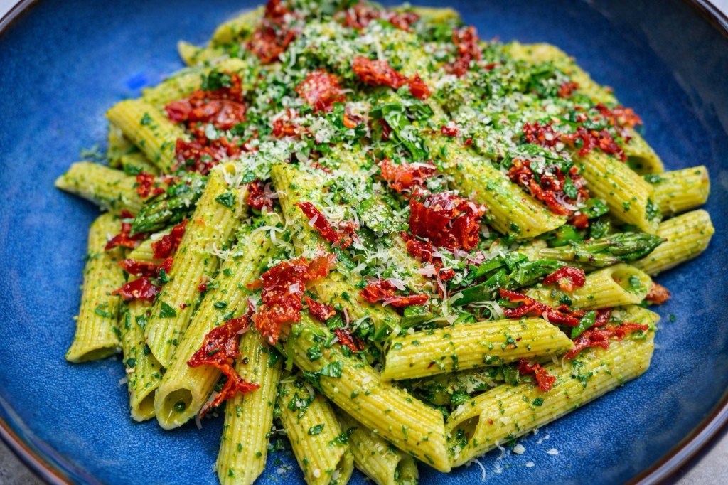 Penne and Asparagus with Arugula Pesto Sauce and Crispy Prosciutto