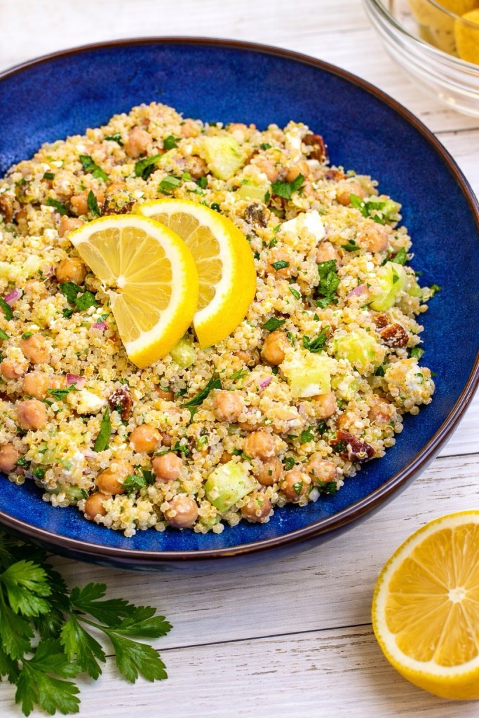 Happy Tuesday! I hope everyone is enjoying their summer so far! This week on my blog, I have a delicious and refreshing summer salad to share. Last month, I was at a family barbecue. My husband’s cousin made this amazing quinoa and chickpea salad that I loved!! She sent me the recipe and I’ve been making it quite often. It’s become my new favorite summer salad! This salad is packed with so many incredible flavors! From the quinoa, chickpeas, onion, crunchy cucumbers, roasted pistachios, fresh herbs and crumbled feta cheese. It’s a great healthy and high protein salad that will keep you satiated. I love eating it on its own or even pairing it with grilled chicken or fish. Enjoy the rest of the week!
