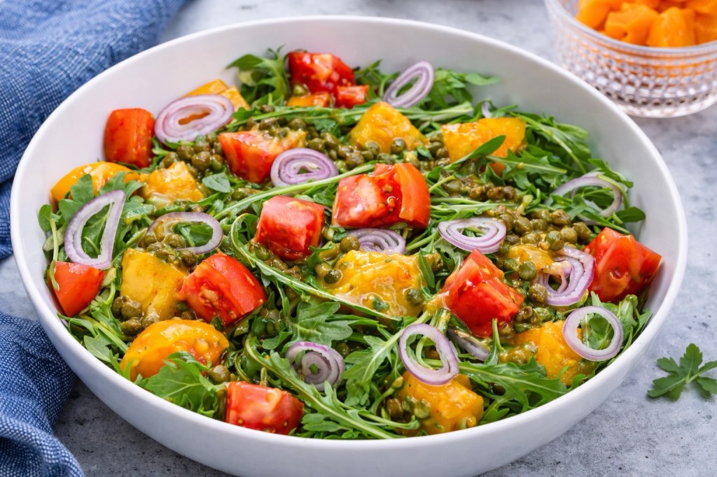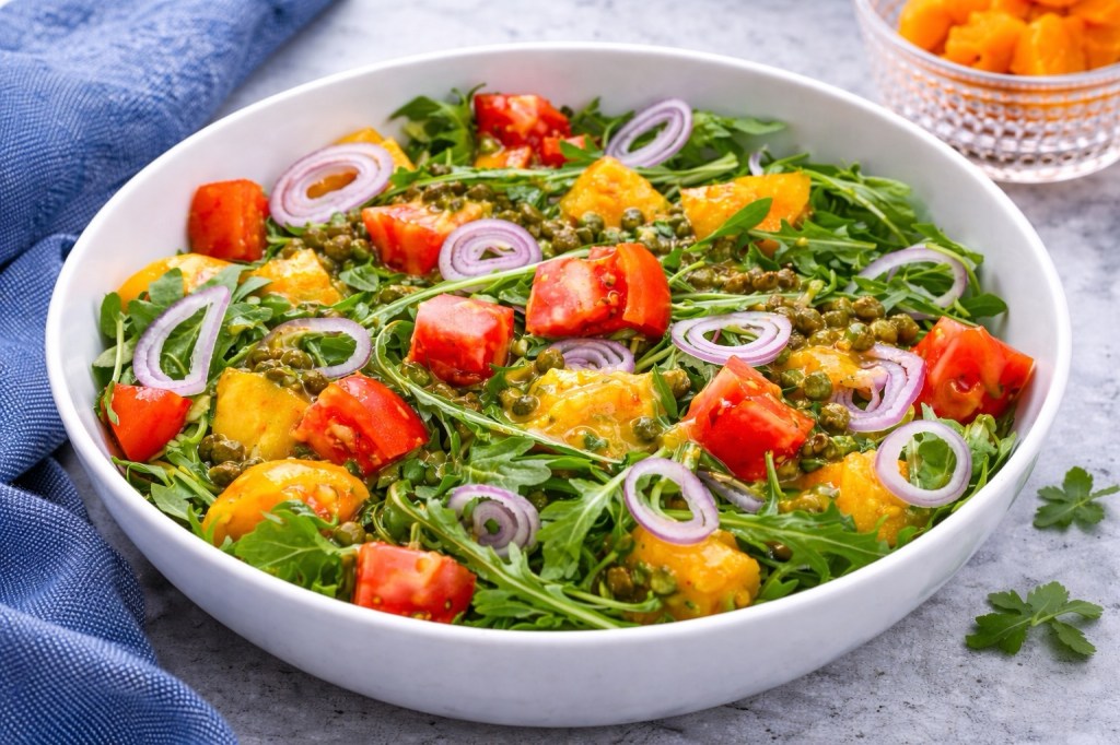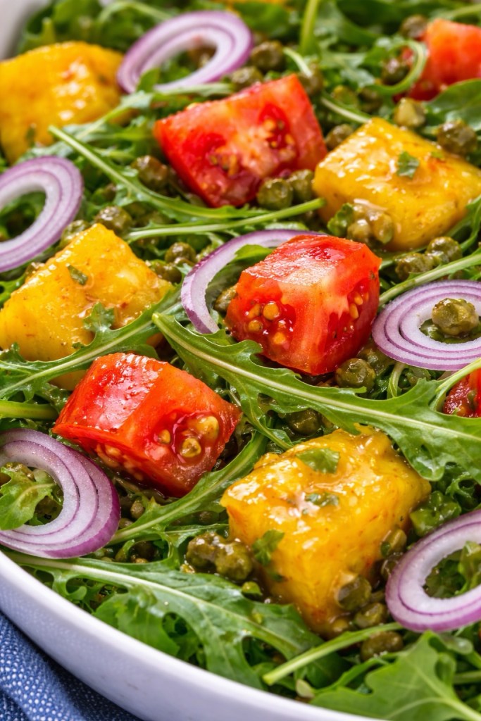 Happy Tuesday friends! With only a few more days left of summer, I wanted to share a delicious heirloom tomato salad I created. This salad is nothing short of flavor. From the juicy tomatoes, peppery arugula and shallots, this salad is summer in a bowl! The star of this tasty salad is the caper vinaigrette! If you are looking for a quick and easy salad to put together, then look no further! Pair this salad with your favorite protein and you have the perfect meal! Have a great week!