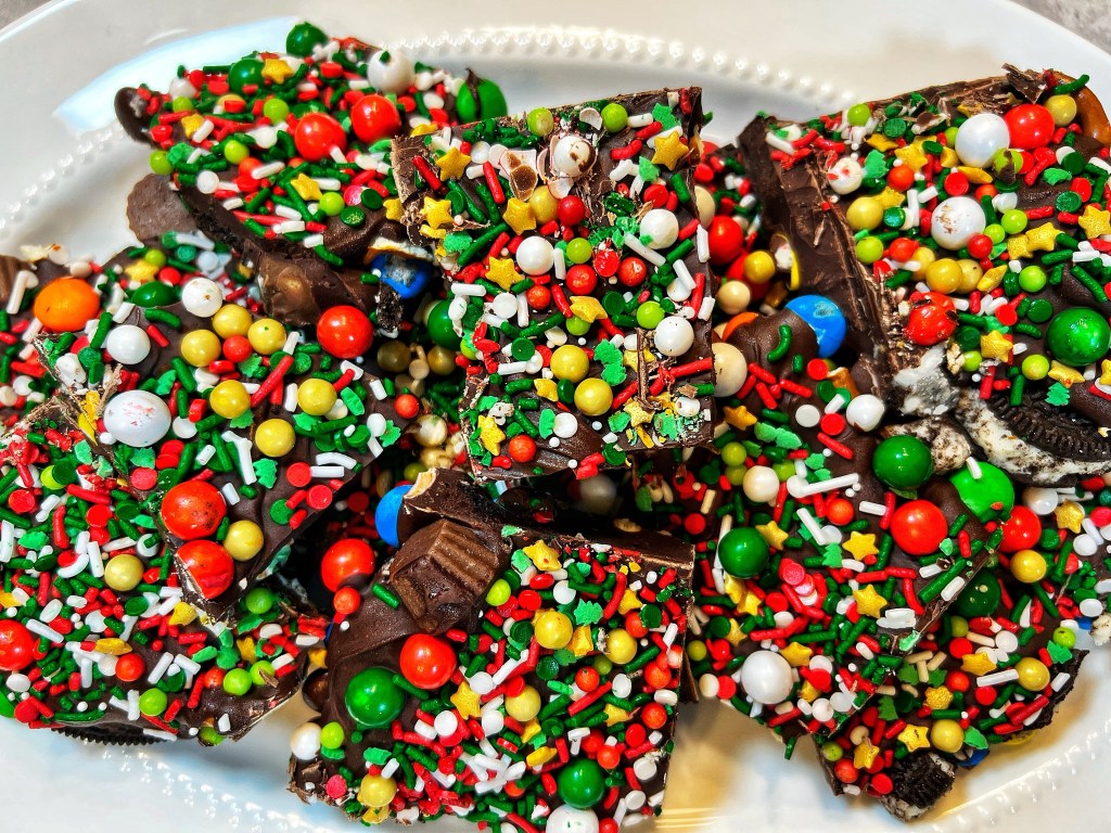 Measure out all ingredients. Line a baking sheet with parchment paper and scatter Oreos, pretzels, mini peanut butter cups and M&M’s. The ingredients should be touching, but not overlapping; set aside. In a large microwave-safe bowl add chocolate chips and melt on high power for 30 seconds. Stop to check and stir. Reheat in 15 second intervals until chocolate is completely smooth. Evenly drizzle chocolate over ingredients on baking sheet. Before chocolate sets, evenly sprinkle with decorative sprinkles. If you have any extra dry ingredients you can use the rest of those as well. Place tray in freezer for about 30-45 minutes. If bark is too soft leave it in the freezer for an additional 10-15 minutes. Cut bark into pieces and enjoy! Keep bark in cool place or refrigerator. * Note: when you are ready to serve bark take it out 15-20 minutes prior to serving.
