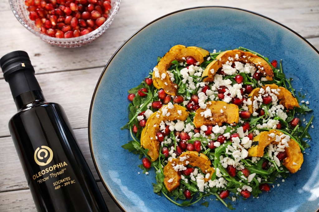 I created a delicious Winter Delicata Squash Salad with Oleosophia’s extra virgin olive oil. I used the extra virgin olive oil to roast the delicata squash. I also utilized the extra virgin olive oil to create an apple cider vinaigrette that was paired with this salad. What I love about Oleosophia’s extra virgin olive oil is you can cook and bake with it.