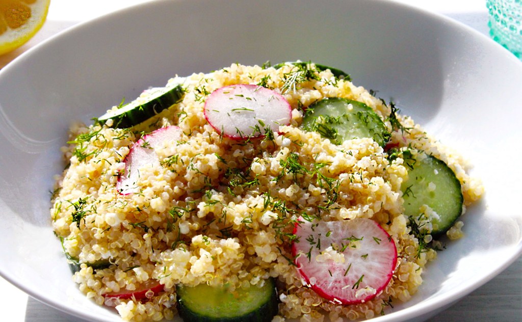 Combine all the ingredients for the lemon vinaigrette in a small bowl. Whisk all ingredients until thoroughly combined. Adjust seasonings accordingly. Set salad dressing aside. In a large mixing bowl, add in quinoa, cucumbers, radishes, and feta cheese. Mix all the salad ingredients together until everything is combined. Pour lemon vinaigrette over salad and toss. Garnish salad with fresh dill and serve. Enjoy!
