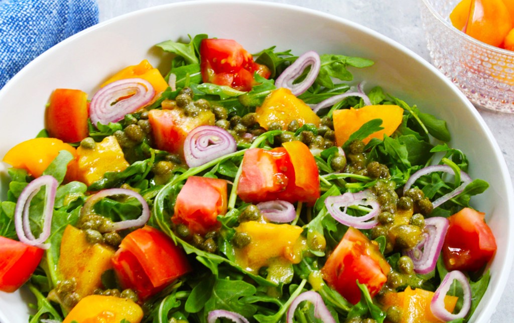 In a small bowl or jar, add all ingredients for caper vinaigrette. Whisk or shake ingredients. Set aside. In a large salad bowl, add arugula, tomatoes and shallots. Pour capers vinaigrette over salad and toss until greens are coated in vinaigrette.