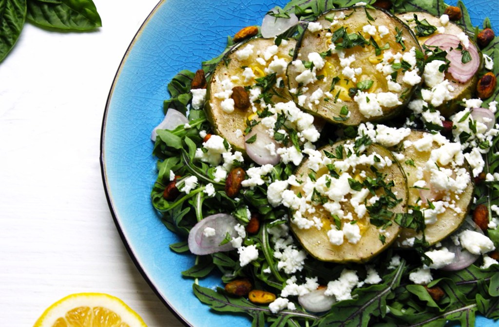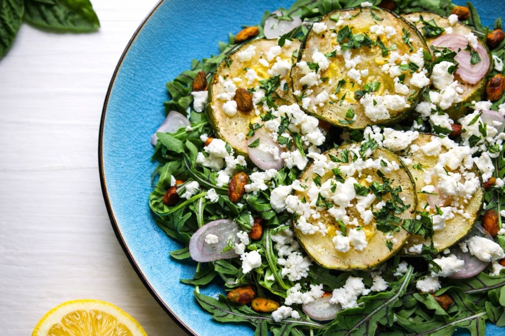 Happy Tuesday friends! My garden has been producing so many zucchini this summer! I have been trying to create some zucchini recipes. This week, on my blog I have a delicious Grilled Zucchini Salad to share. For this salad, I used arugula. It is my favorite and I love adding it to salads. I added some shallots, pistachios for a crunchy texture and crumbled feta cheese. Lastly, I added some parsley and basil from my garden. Fresh herbs really elevate a dish and add some nice color too! I drizzled some extra virgin olive oil, lemon juice, salt and pepper on top of the salad. This salad can easily be paired with grilled chicken, steak or even fish. Enjoy!