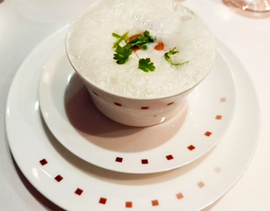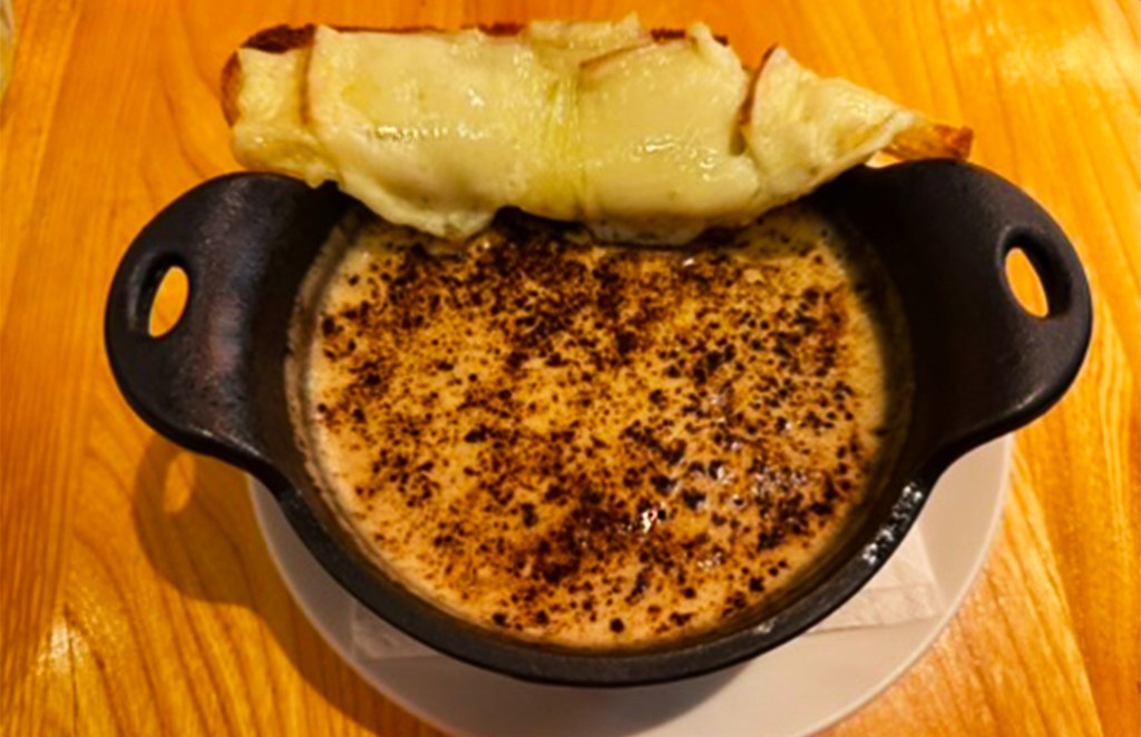 Left: Onion soup cappuccino style, croutons with comtomme cheese