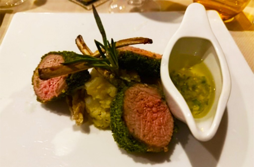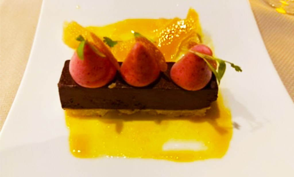 Right: Organic chicken jambonnette with duck, creamy polenta, Melanie’s roasted tomatoes, willowherb and smoked blackcurrant