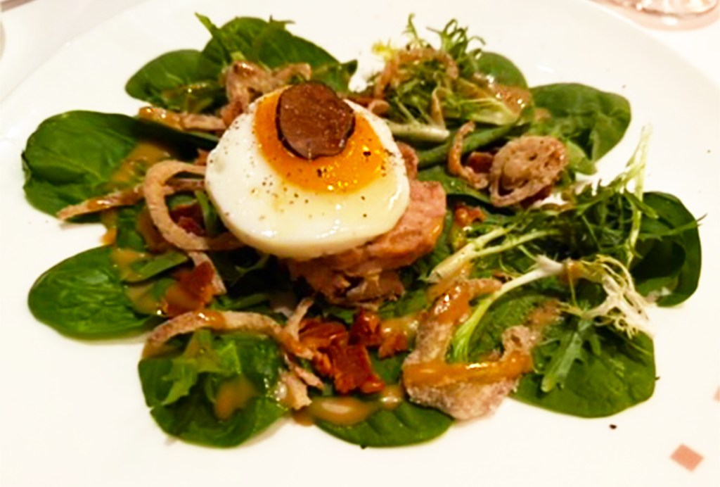 Young Spinach and Frisée Salad- shallot-truffle vinaigrette, sunny side egg, pork rillettes & brioche crouton