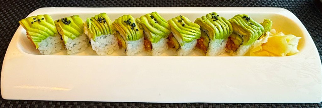 Green Roof Tuna Roll- Spicy tuna, cucumber, avocado, black sesame