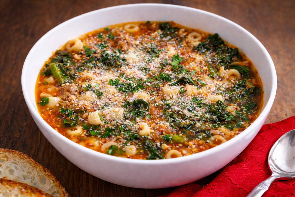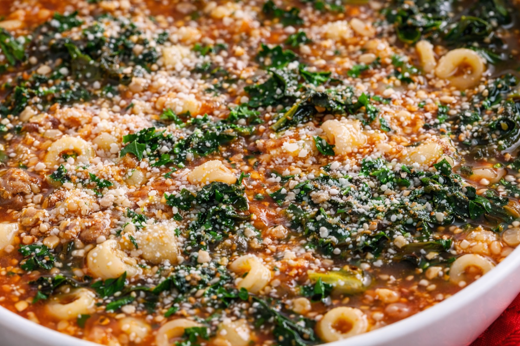 In a large soup pot, heat olive oil over medium heat. Add in onions, garlic and Italian seasoning. If you don’t have any Italian seasoning, any all-purpose seasoning works well too. Stir the onions and garlic for 2-3 minutes, or until onions are translucent. Season with salt and pepper. To the soup pot, add in chicken stock, tomato sauce, cheese, and sausage. Bring to a boil; reduce heat and simmer covered, about 10 mins. Add in ditalini pasta or any other type of pasta you are using. Cook until pasta is done. Stir in kale until wilted, about 2 minutes. Add in fresh basil and parsley and stir. Adjust seasonings accordingly. Serve in a soup bowl and enjoy!