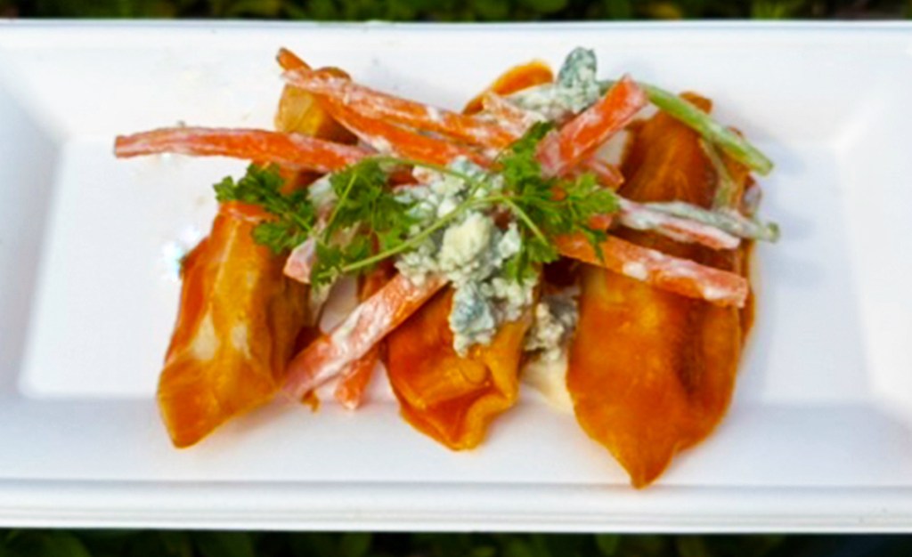 Buffalo-style Dumplings: Chicken dumplings with Buffalo Sauce, Celery Root Purée, Blue Cheese Cream, Crumbled Blue Cheese, Shaved Carrot, and Micro Celery