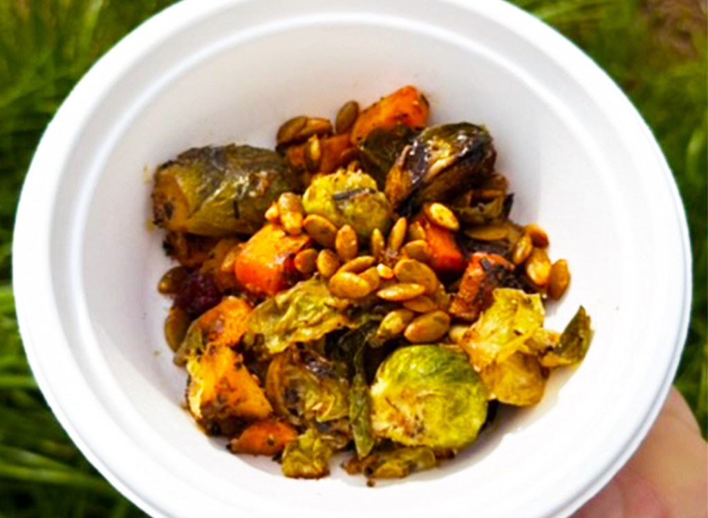 Cast Iron-roasted Brussel Sprouts and Root Vegetables- Dried Cranberries, Spiced Pumpkin Seeds, and Pumpkin Seed Vinaigrette