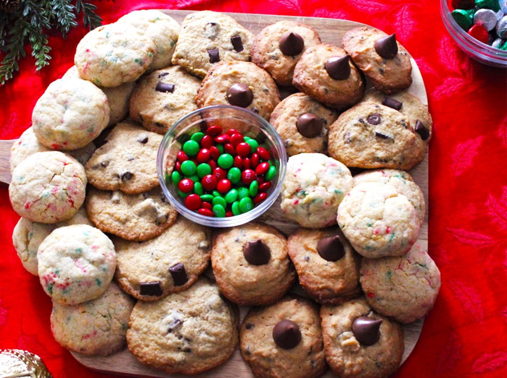 Hi friends! It’s crazy to think we are only one day away from Christmas!! I have a last minute dessert I wanted to share. I put together a fun and festive sweet charcuterie board! This board is easy to put together and will be a huge hit at your holiday gathering! The three different type of cookies I made are, Peanut Butter Blossoms, Holiday Edition Sugar Cookies and Brown Butter Chocolate Chip Cookies. These cookies were a lot of fun to make! If you have a cookie swap party, Christmas party or any type of gathering, this is the perfect dessert!