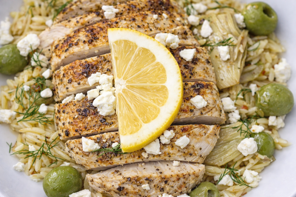 Tender, herb-seasoned chicken is served over a bed of lightly dressed orzo with shallots, citrus, and fresh herbs. It’s light enough for spring, but still satisfying enough to anchor a dinner.