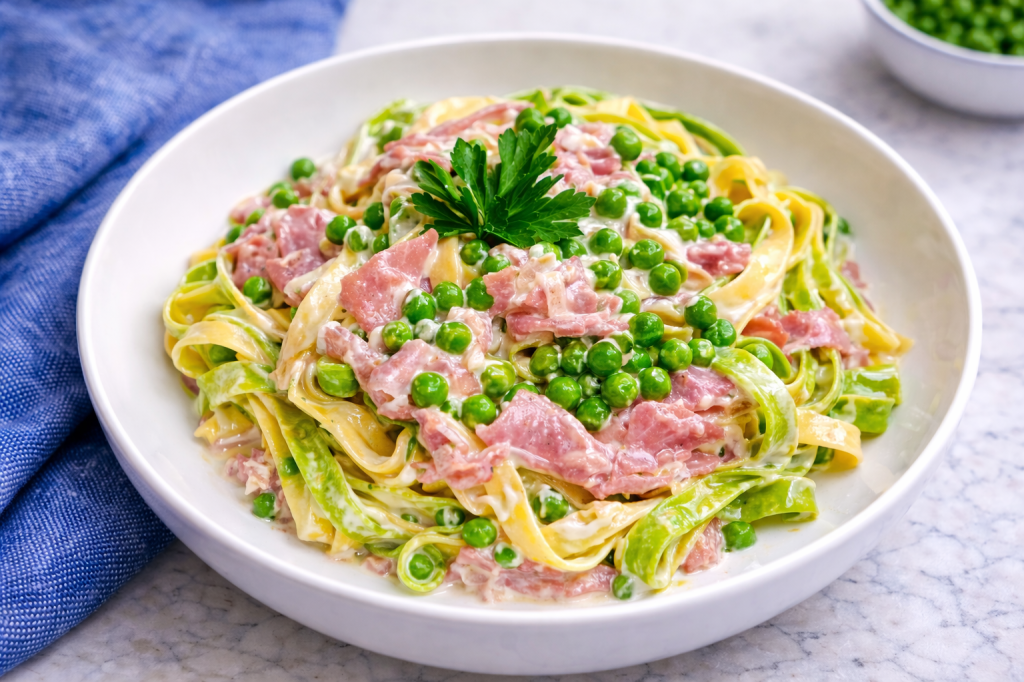 Sweet peas, delicate ribbons of pasta, and savory prosciutto come together in a light, silky sauce that feels comforting without being heavy. It’s simple, seasonal, and always a crowd-pleaser.