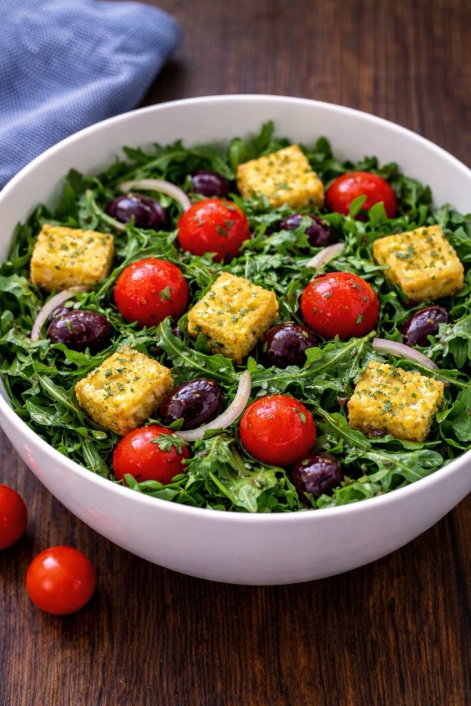 This salad is everything I love about spring in one bowl—peppery arugula, juicy tomatoes, briny olives, and crisp, golden croutons tossed in a simple, flavorful dressing.