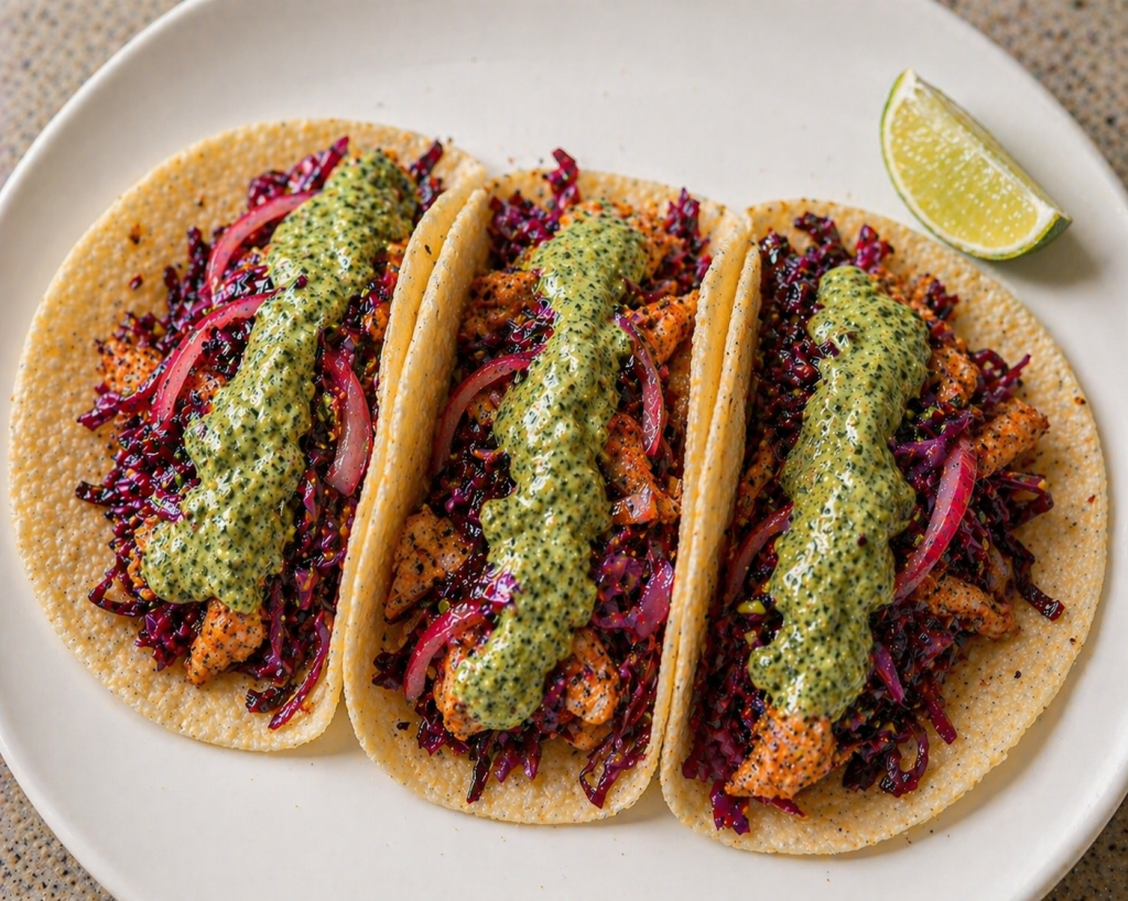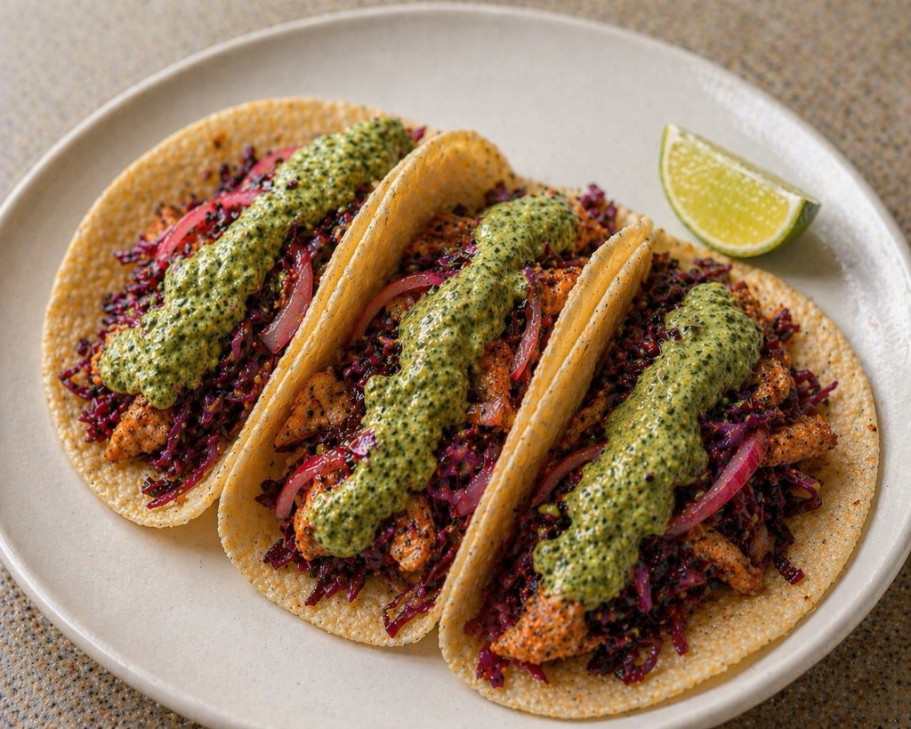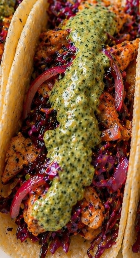 Juicy, seasoned chicken is tucked into warm tortillas and topped with a crisp cabbage slaw and pickled onions for brightness and crunch. Everything is finished with a creamy cilantro sauce that ties it all together—rich, fresh, and just a little indulgent in the best way.